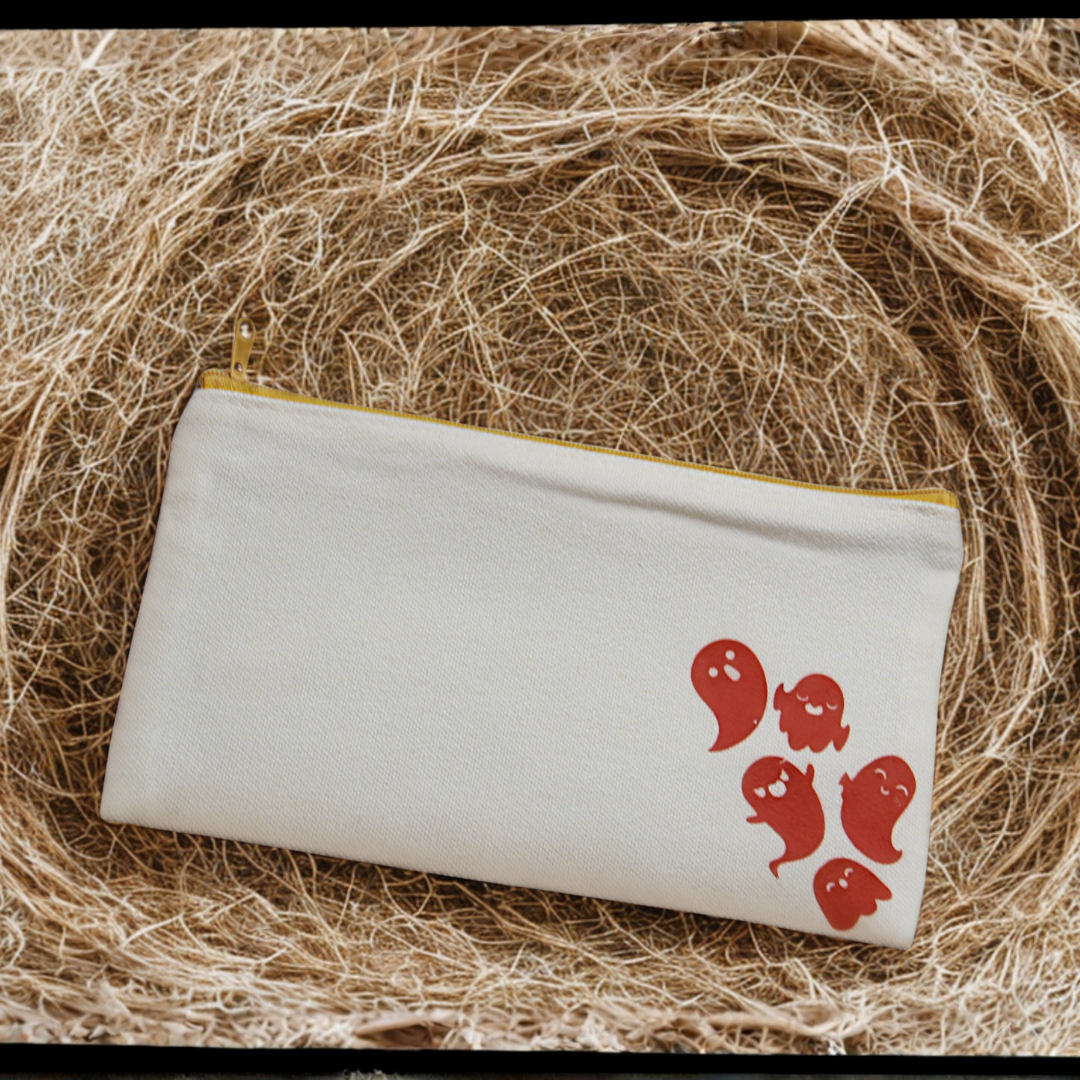 Přidejte do svých doplňků kousek hravého kouzla s naším pouzdrem s duchy. Tento béžový sáček je ozdoben roztomilými, usmívajícími se duchy v živé oranžové barvě. Ideální pro udržení vašich nezbytností v pořádku, ať už jde o kosmetiku, kancelářské potřeby nebo malé drobnosti. Skvělý a hravý doplněk, který je ideální pro každé roční období, obzvlášť Halloween!